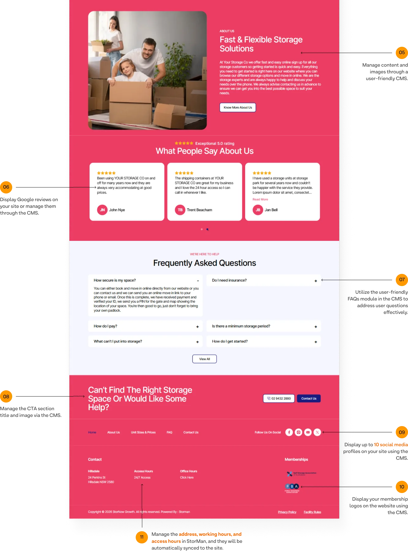 Manage the address, working hours, and access hours in StorMan, and they will be automatically synced to the site.
