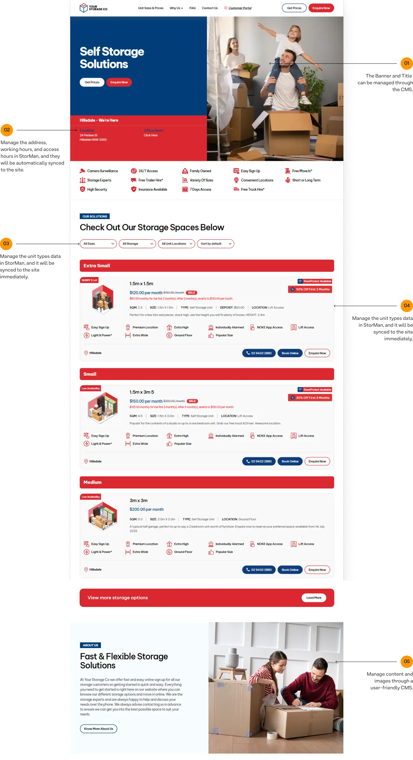 Manage the unit types data in StorMan, and it will be synced to the site immediately.
